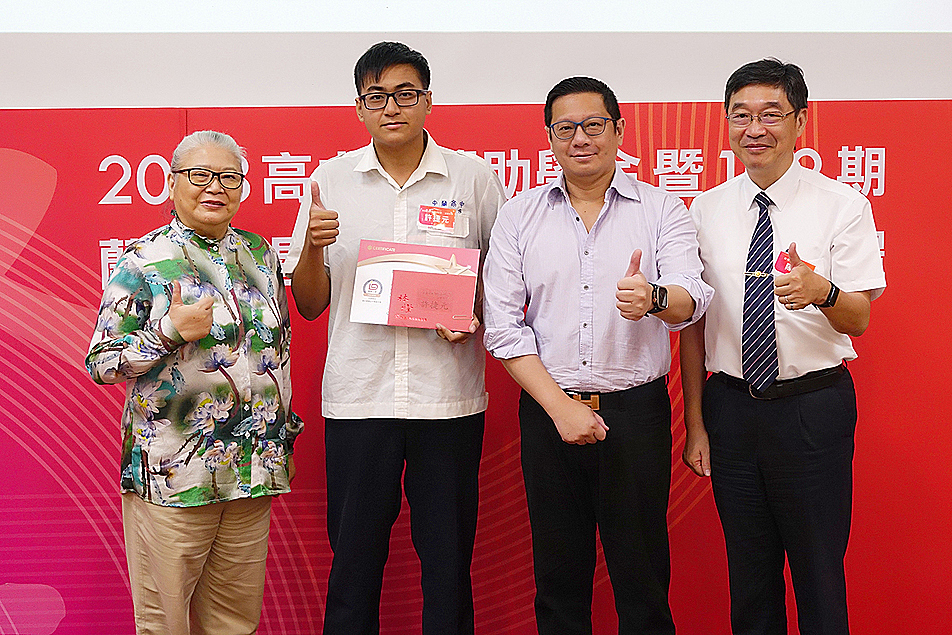 去年在全國賽獲得「最佳辯士」獎項的宜中校友許捷元,今年以評審身份回歸,過去也曾透過基金會的培育計畫,累積了精彩的學習歷程,成功以「特殊選才」錄取師大英文系。(圖左起:林燈基金會林純美執行長、宜蘭高中許捷元同學、中保科技集團林明昇副總裁、蘭陽女中陳銓校長)