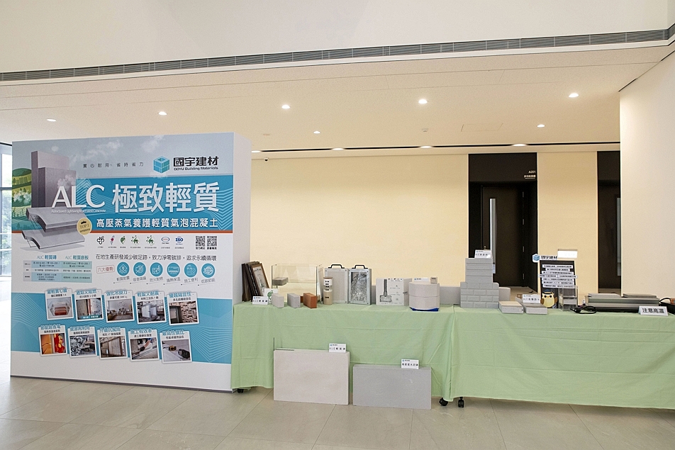 國宇ALC輕質嵌板則符合健康、環保、低碳、節能、循環五大要素,適用於外牆、屋頂、地板系統,具備3小時防火時效,並通過TAF風雨測試,抗風壓達4,500Pa,等同17級強颱等級。同時取得再生與高性能綠建材雙標章,熱傳透率僅1.26 W/(m²•K),約為法規標準值的一半,省電可達40%,具備優異的隔熱與節能效益。