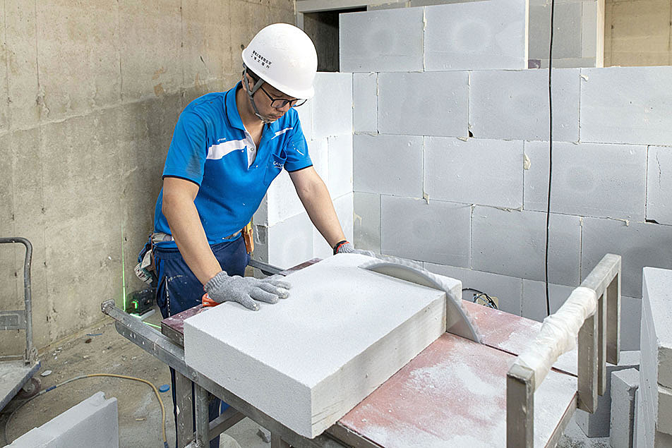 A:國宇建材生產以ALC為核心的牆體系統,包括「ALC輕質磚/ALC嵌板」,以國宇ALC輕質磚來說,施工方式較傳統砌磚更具效率與彈性,現場可切、可刨,採乾式施工砌做牆面,並採用輕質磚專用黏著劑,避免面層開裂的可能,同時為減少不同材質接觸面發生位移變形,也預留伸縮縫並填充PU發泡填縫劑作為柔性連接。牆體堆砌完成後,隔天水電工程即可進場進行配管作業,最後再進行批土與油漆等表面處理,即可完成輕質磚實心牆體。整體施工流程簡化,不僅節省工時與人力,也讓工地環境更整潔,有效提升施工效率。