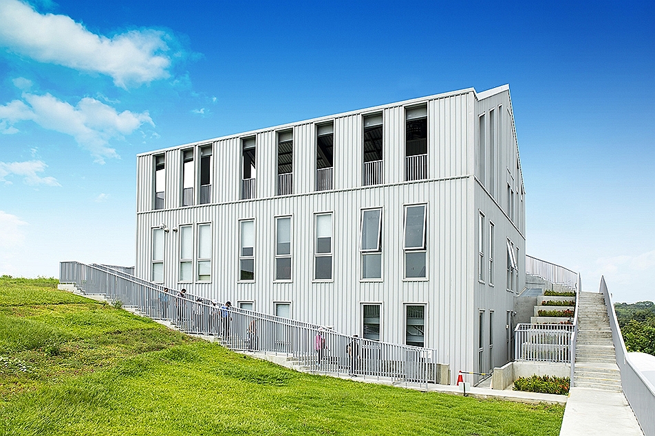 改造後的新化果菜市場徹底擺脫傳統市場昏暗擁擠的印象。占地八公頃的基地採灰色建築量體,內部以挑高、開放且明亮的空間配置各式攤商,彷彿大型美式賣場般寬敞舒適。建築外觀則以綠色地景概念設計,波浪式起伏的屋頂猶如一座座丘陵,與周遭自然景觀相互呼應。令人驚艷的是,民眾穿梭於市場之後,還能沿著動線登上屋頂,漫步於宛如空中花園般的綠色山丘。屋頂鋪設土壤與植栽,不僅形成城市中的放鬆步道,也具備優秀的降溫效果,減少能耗,因此獲得綠建築銀級認證。