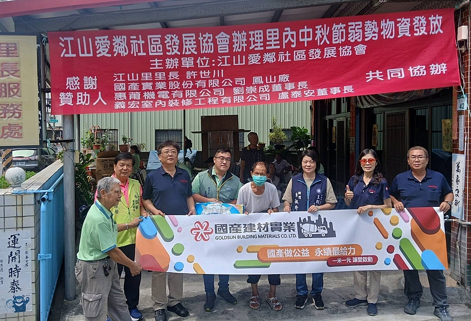 國產鳳山廠位於江山路,長期與江山里保持良好互動,並與「江山愛鄰社區發展協會」合作,提供物資協助社區內經濟弱勢家庭。近期更參與協會中秋弱勢物資發放活動,與里長及志工共同將祝福送至弱勢族群與獨居長者,讓中秋不僅是團圓節,更成為社區守望相助的時刻。國產鳳山廠秉持「一米一元」精神,以實際行動關懷弱勢,持續深耕地方、回饋社會,為社區帶來溫暖與支持。