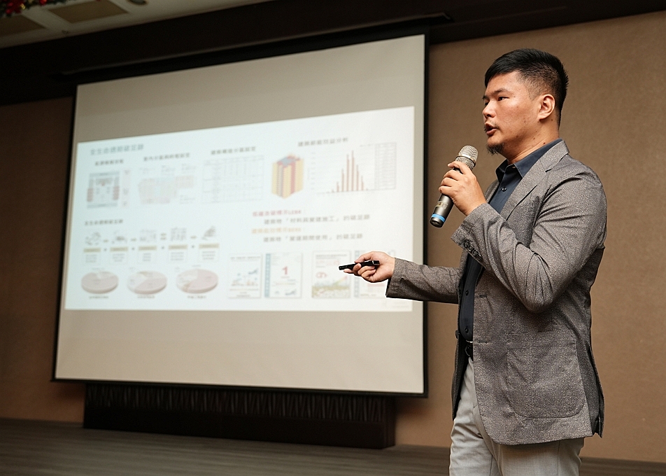 首先邀請到昊辰永續設計顧問有限公司執行長謝昀昊,以「從低碳認證到設計策略,建築碳排放結構與決策重點」進行分享。謝昀昊指出,公司團隊來自成大建築系環控組蔡耀賢教授研究室,蔡教授是「低碳(低蘊含碳)建築評估手冊」重要改版人,也是低碳建築聯盟推手,因此對低碳建築評估與認證制度具備深厚實務經驗。