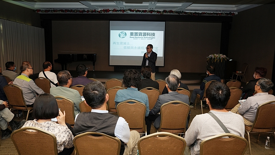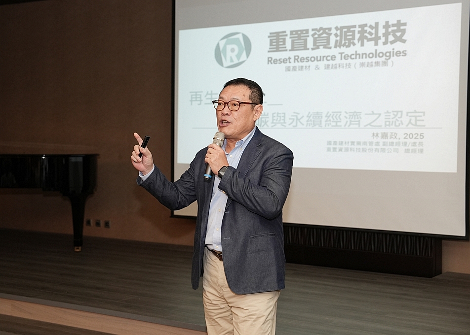 最後由國產建材實業南管處處長、重置資源科技總經理林嘉政,以「循環經濟與永續經濟活動之認定」為題,提出重置資源科技扮演的的循環經濟角色,以及建築廢棄物去化的具體解方。他表示,國產建材集團支持低碳循環經濟佈局,在2024年成立重置資源科技,可將營建廢棄物與剩餘土石方產品化再利用,製成再生混凝土,符合低碳混凝土、綠建材之標準的產品。
