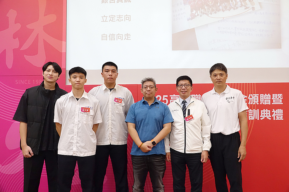宜中籃球隊教練團和獲獎同學,於會後與中保科技集團林孝信總裁(中)、中保科技林建涵董事長(前排左四)、基金會林純美總執行長(前排左三)、宜蘭高中洪光賢校長(前排右三)合影。